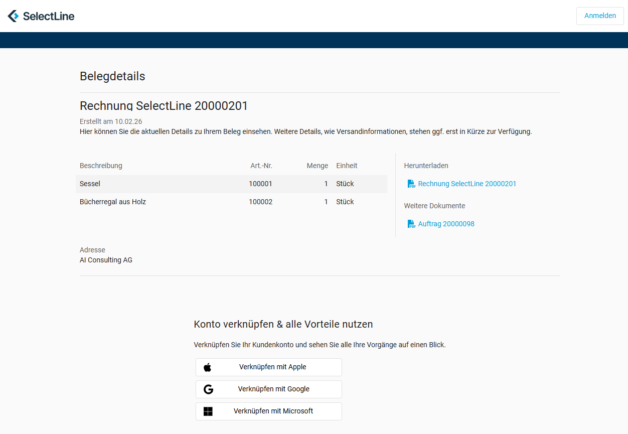 Mit dem SelectLine Kundenportal stellen Sie Ihren Kunden Rechnungen, Lieferscheine & Co. sicher und bequem online bereit – direkt aus SelectLine Auftrag. Ihre Kunden greifen per Link oder Login auf ihre Belege zu, können diese herunterladen und bleiben dank automatischer E-Mail-Benachrichtigungen immer auf dem Laufenden.