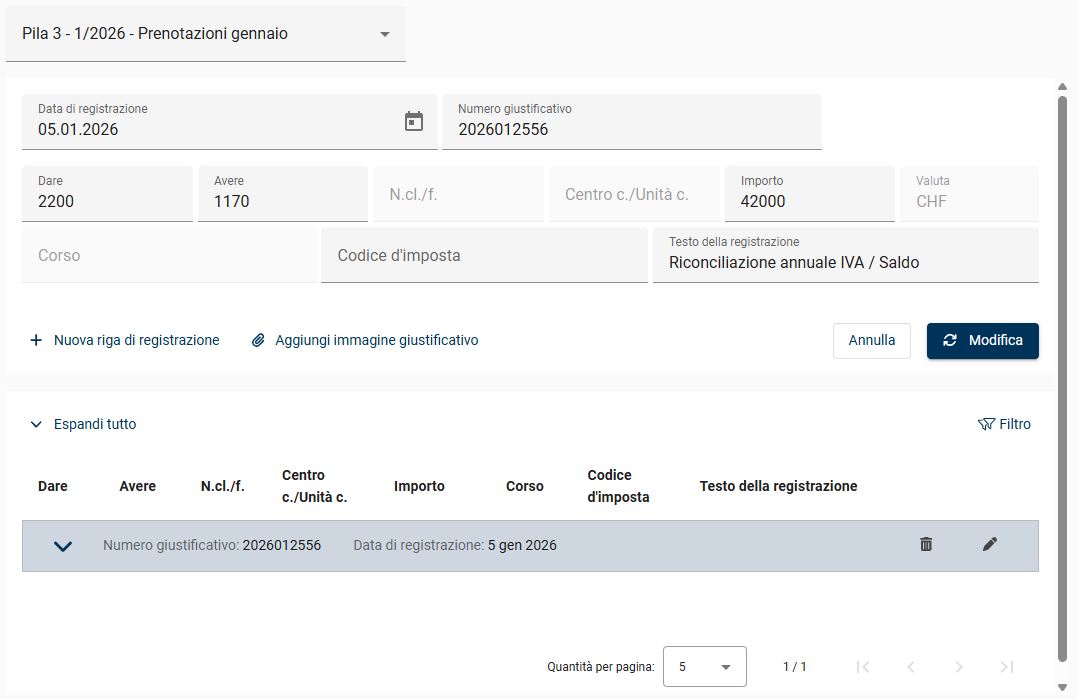 Nel Finance Portal è possibile preparare le registrazioni effettuate con pochi clic come batch di registrazione, compreso lo stato in cui si trovano (pronto, acquisito o ancora in fase di verifica). Il batch viene trasferito automaticamente nella contabilità SelectLine, dove è disponibile per l'ulteriore elaborazione. In questo modo è possibile verificare e completare il batch prima della registrazione.